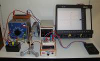 • Der Strom für die Spulen (Tischtrafo) wird durch den kleinen Widerstand geleitet (liegt auf dem Tischtrafo). Die Spannung am Widerstand dient zur Strommessung durch den x-y-Schreiber (x-Eingang, x-Achse). Bei 0.5Ω Widerstand und der Einstellung 0.5V/cm am Schreiber erhalten wir an der x-Achse 1A pro cm.